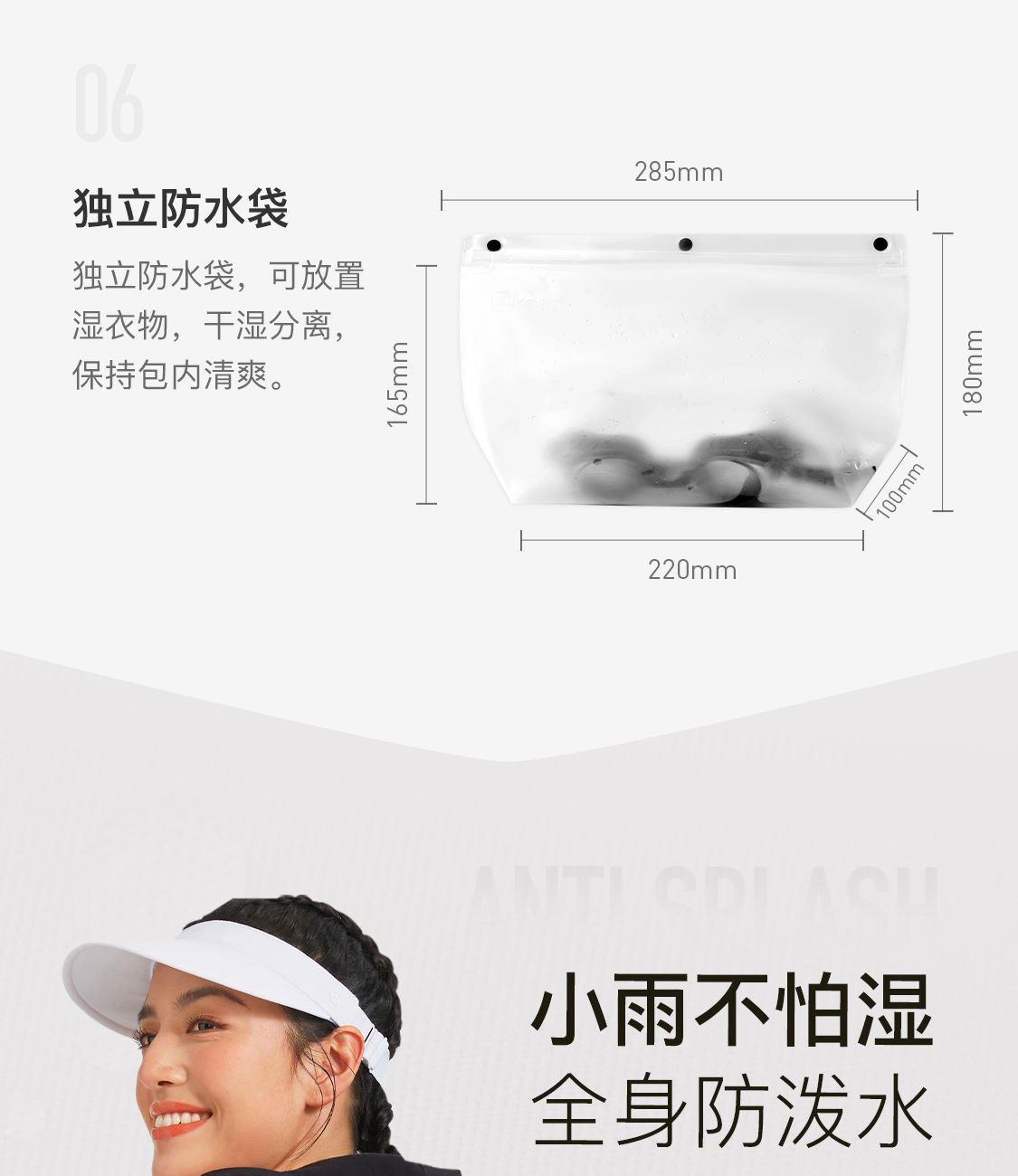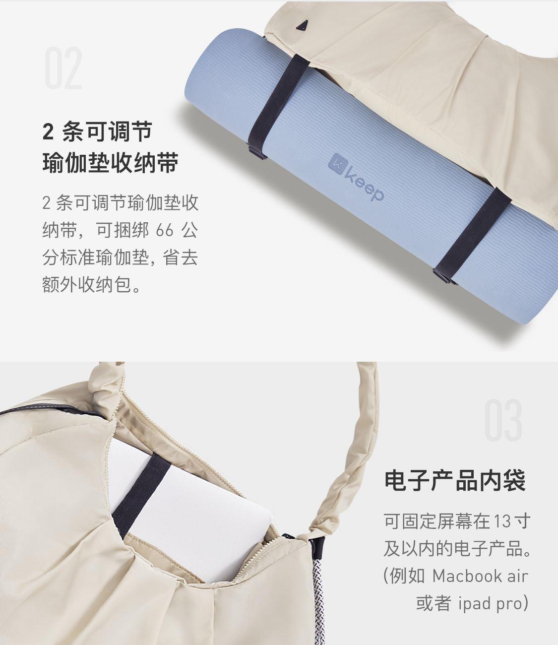 右側(cè)開放式口袋,2條可調(diào)節(jié)瑜伽墊收納帶,電子產(chǎn)品內(nèi)袋,左側(cè)獨(dú)立鞋倉(cāng),隱藏拉鏈?zhǔn)絻?nèi)袋,獨(dú)立防水袋尺寸