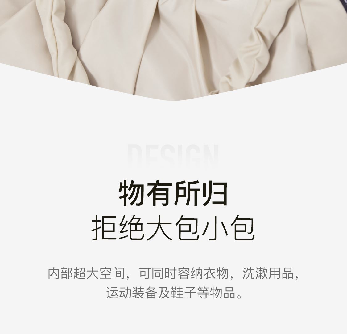 內(nèi)部超大空間,可同時(shí)容納衣物,洗漱用品,運(yùn)動(dòng)裝備及鞋子等物品
